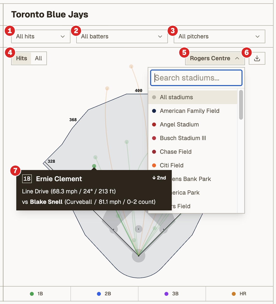 Navigate to the spray chart tab to see trajectories for all balls put into play during the game. Each ball is represented as a small dot, with a path representing its trajectory, coloured by type of hit. The spray chart is overlaid on the stadium outline the game was played at, with field dimensions where available. Games without stadium outlines are shown on Rogers Centre (for now). Each team has a chart, with the following functionality: