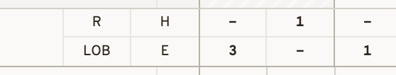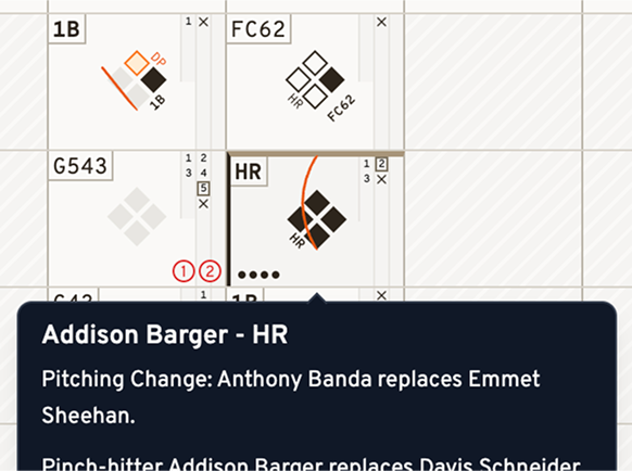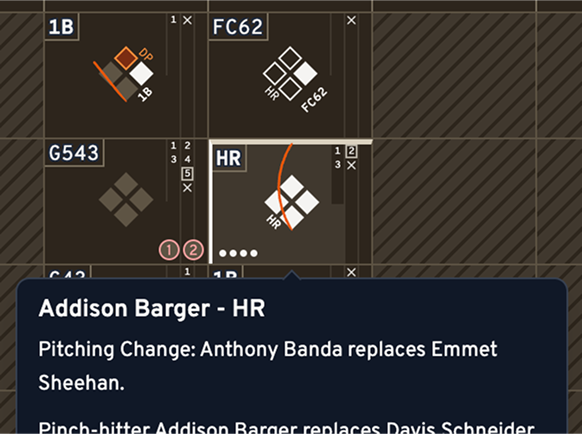 - Substitutions as cell borders. A top border indicates a pitching change, a left-border a pinch-hitter, a right-border a pinch-runner, and a left or right border a defensive replacement.