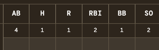 Each batter's in-game stats are shown in the last few columns of their table. Total at-bats (AB), runs (R), hits (H), RBIs (RBI), walks (BB) and strikeouts (SO) are shown. Substitute players stats are shown on a darker background.