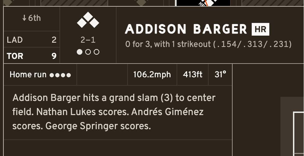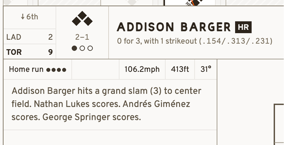 Below the player's name is their performance so far this game, the result of their last plate appearance, and their slash line for the season. In the first column below that is displayed the play-by-play description for this at-bat, when complete, as well as the player's subsequent movements around the basepaths.