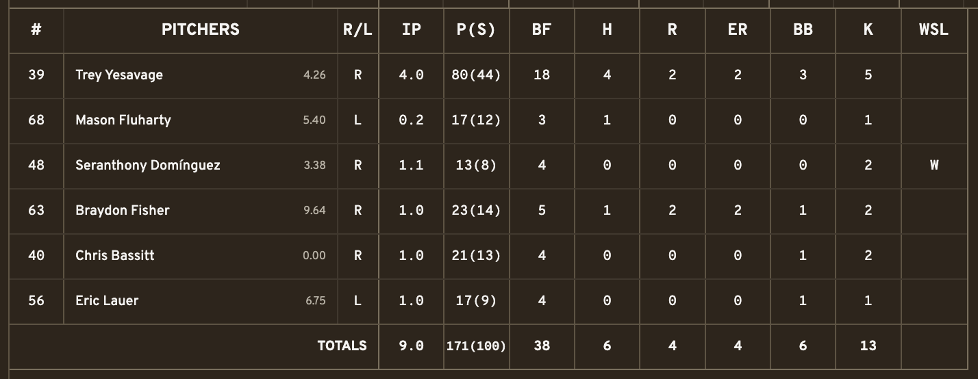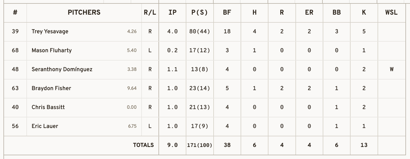 Each pitcher's in-game stats are shown in the pitcher's table at the bottom of each scorecard section. Innings pitched (IP), total pitches/strikes (P(S)), batters faced (BF), hits allowed (H), runs allowed (R), earned runs allowed (ER), walks (BB) and strikeouts (SO) are shown, along with pitcher handedness, ERA, jersey number, and if they are credited with a win, loss, hold, or save.