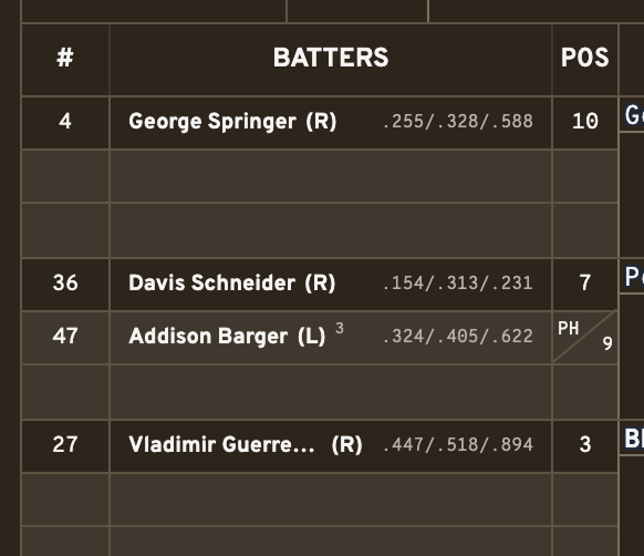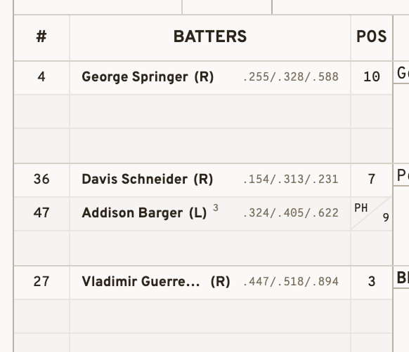 Each batter's row shows the starting player's name, jersey number, and position. Next to the player's name is their handedness and slash line, which updates during games.